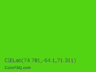 CIELab 74.781,-64.1,71.311 Color is a normal green color and the nearest color is Harlequin Green #46cb18. Hex code #52d212 and RGB value is rgb(82,210,18). In RGB color space, this color is composed of 32% red, 82% green, 7% blue, In CMYK color space, this color is composed of 61% cyan, 0% magenta, 91% yellow , 18% black , In HSL color space, this color has a hue angle of 100° , 84% saturation and 45% lightness.