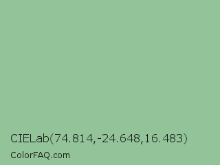 CIELab 74.814,-24.648,16.483 Color is a light green color and the nearest color is Eton Blue #96c8a2. Hex code #93c499 and RGB value is rgb(147,196,153). In RGB color space, this color is composed of 58% red, 77% green, 60% blue, In CMYK color space, this color is composed of 25% cyan, 0% magenta, 22% yellow , 23% black , In HSL color space, this color has a hue angle of 127° , 29% saturation and 67% lightness.