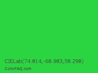 CIELab 74.814,-68.983,58.298 Color is a normal green color and the nearest color is Lime Green #32cd32. Hex code #2bd441 and RGB value is rgb(43,212,65). In RGB color space, this color is composed of 17% red, 83% green, 25% blue, In CMYK color space, this color is composed of 80% cyan, 0% magenta, 69% yellow , 17% black , In HSL color space, this color has a hue angle of 128° , 66% saturation and 50% lightness.