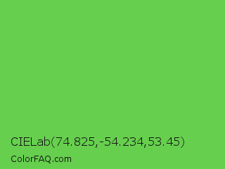CIELab 74.825,-54.234,53.45 Color is a normal green color and the nearest color is Mantis #74c365. Hex code #66cf4e and RGB value is rgb(102,207,78). In RGB color space, this color is composed of 40% red, 81% green, 31% blue, In CMYK color space, this color is composed of 51% cyan, 0% magenta, 62% yellow , 19% black , In HSL color space, this color has a hue angle of 109° , 57% saturation and 56% lightness.