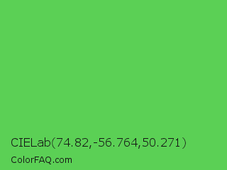CIELab 74.82,-56.764,50.271 Color is a normal green color and the nearest color is Mantis #74c365. Hex code #5bd055 and RGB value is rgb(91,208,85). In RGB color space, this color is composed of 36% red, 82% green, 33% blue, In CMYK color space, this color is composed of 56% cyan, 0% magenta, 59% yellow , 18% black , In HSL color space, this color has a hue angle of 117° , 57% saturation and 57% lightness.