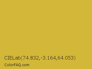 CIELab 74.832,-3.164,64.053 Color is a normal yellow color and the nearest color is Old Gold #cfb53b. Hex code #d3b739 and RGB value is rgb(211,183,57). In RGB color space, this color is composed of 83% red, 72% green, 22% blue, In CMYK color space, this color is composed of 0% cyan, 13% magenta, 73% yellow , 17% black , In HSL color space, this color has a hue angle of 49° , 64% saturation and 53% lightness.