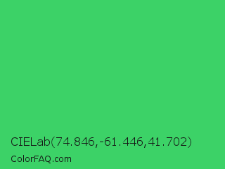 CIELab 74.846,-61.446,41.702 Color is a normal green color and the nearest color is UFO Green #3cd070. Hex code #3cd267 and RGB value is rgb(60,210,103). In RGB color space, this color is composed of 24% red, 82% green, 40% blue, In CMYK color space, this color is composed of 71% cyan, 0% magenta, 51% yellow , 18% black , In HSL color space, this color has a hue angle of 137° , 63% saturation and 53% lightness.