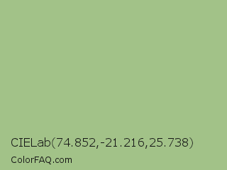 CIELab 74.852,-21.216,25.738 Color is a light green color and the nearest color is Swamp Green #acb78e. Hex code #a2c288 and RGB value is rgb(162,194,136). In RGB color space, this color is composed of 64% red, 76% green, 53% blue, In CMYK color space, this color is composed of 16% cyan, 0% magenta, 30% yellow , 24% black , In HSL color space, this color has a hue angle of 93° , 32% saturation and 65% lightness.