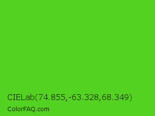CIELab 74.855,-63.328,68.349 Color is a normal green color and the nearest color is Harlequin Green #46cb18. Hex code #53d222 and RGB value is rgb(83,210,34). In RGB color space, this color is composed of 33% red, 82% green, 13% blue, In CMYK color space, this color is composed of 60% cyan, 0% magenta, 84% yellow , 18% black , In HSL color space, this color has a hue angle of 103° , 72% saturation and 48% lightness.