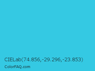 CIELab 74.856,-29.296,-23.853 Color is a normal cyan color and the nearest color is Scooter #2ebfd4. Hex code #34c9e3 and RGB value is rgb(52,201,227). In RGB color space, this color is composed of 20% red, 79% green, 89% blue, In CMYK color space, this color is composed of 77% cyan, 11% magenta, 0% yellow , 11% black , In HSL color space, this color has a hue angle of 189° , 76% saturation and 55% lightness.
