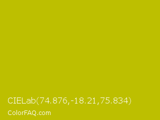 CIELab 74.876,-18.21,75.834 Color is a normal yellow color and the nearest color is La Rioja #b3c110. Hex code #bdbf00 and RGB value is rgb(189,191,0). In RGB color space, this color is composed of 74% red, 75% green, 0% blue, In CMYK color space, this color is composed of 1% cyan, 0% magenta, 100% yellow , 25% black , In HSL color space, this color has a hue angle of 61° , 100% saturation and 37% lightness.