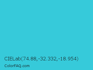CIELab 74.88,-32.332,-18.954 Color is a normal cyan color and the nearest color is Scooter #2ebfd4. Hex code #36cada and RGB value is rgb(54,202,218). In RGB color space, this color is composed of 21% red, 79% green, 85% blue, In CMYK color space, this color is composed of 75% cyan, 7% magenta, 0% yellow , 15% black , In HSL color space, this color has a hue angle of 186° , 69% saturation and 53% lightness.