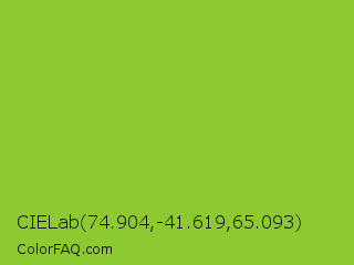 CIELab 74.904,-41.619,65.093 Color is a normal green color and the nearest color is Atlantis #97cd2d. Hex code #8dca31 and RGB value is rgb(141,202,49). In RGB color space, this color is composed of 55% red, 79% green, 19% blue, In CMYK color space, this color is composed of 30% cyan, 0% magenta, 76% yellow , 21% black , In HSL color space, this color has a hue angle of 84° , 61% saturation and 49% lightness.