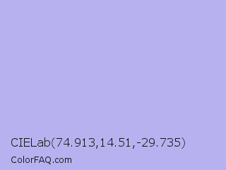 CIELab 74.913,14.51,-29.735 Color is a very light indigo color and the nearest color is Maximum Blue Purple #acace6. Hex code #b7b2ef and RGB value is rgb(183,178,239). In RGB color space, this color is composed of 72% red, 70% green, 94% blue, In CMYK color space, this color is composed of 23% cyan, 26% magenta, 0% yellow , 6% black , In HSL color space, this color has a hue angle of 245° , 66% saturation and 82% lightness.