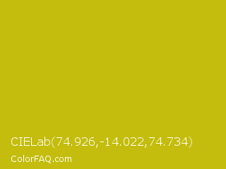 CIELab 74.926,-14.022,74.734 Color is a normal yellow color and the nearest color is La Rioja #b3c110. Hex code #c4bd0d and RGB value is rgb(196,189,13). In RGB color space, this color is composed of 77% red, 74% green, 5% blue, In CMYK color space, this color is composed of 0% cyan, 4% magenta, 93% yellow , 23% black , In HSL color space, this color has a hue angle of 58° , 88% saturation and 41% lightness.