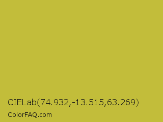 CIELab 74.932,-13.515,63.269 Color is a normal yellow color and the nearest color is Earls Green #c9b93b. Hex code #c2bd3a and RGB value is rgb(194,189,58). In RGB color space, this color is composed of 76% red, 74% green, 23% blue, In CMYK color space, this color is composed of 0% cyan, 3% magenta, 70% yellow , 24% black , In HSL color space, this color has a hue angle of 58° , 54% saturation and 49% lightness.