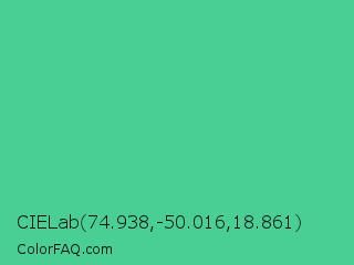 CIELab 74.938,-50.016,18.861 Color is a normal green color and the nearest color is Ocean Green #48bf91. Hex code #49cf94 and RGB value is rgb(73,207,148). In RGB color space, this color is composed of 29% red, 81% green, 58% blue, In CMYK color space, this color is composed of 65% cyan, 0% magenta, 29% yellow , 19% black , In HSL color space, this color has a hue angle of 154° , 58% saturation and 55% lightness.