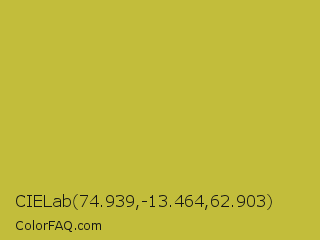 CIELab 74.939,-13.464,62.903 Color is a normal yellow color and the nearest color is Earls Green #c9b93b. Hex code #c2bd3b and RGB value is rgb(194,189,59). In RGB color space, this color is composed of 76% red, 74% green, 23% blue, In CMYK color space, this color is composed of 0% cyan, 3% magenta, 70% yellow , 24% black , In HSL color space, this color has a hue angle of 58° , 53% saturation and 50% lightness.