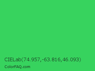 CIELab 74.957,-63.816,46.093 Color is a normal green color and the nearest color is UFO Green #3cd070. Hex code #37d35e and RGB value is rgb(55,211,94). In RGB color space, this color is composed of 22% red, 83% green, 37% blue, In CMYK color space, this color is composed of 74% cyan, 0% magenta, 55% yellow , 17% black , In HSL color space, this color has a hue angle of 135° , 64% saturation and 52% lightness.