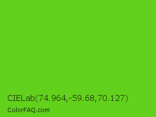 CIELab 74.964,-59.68,70.127 Color is a normal green color and the nearest color is Harlequin Green #46cb18. Hex code #61d11b and RGB value is rgb(97,209,27). In RGB color space, this color is composed of 38% red, 82% green, 11% blue, In CMYK color space, this color is composed of 54% cyan, 0% magenta, 87% yellow , 18% black , In HSL color space, this color has a hue angle of 97° , 77% saturation and 46% lightness.