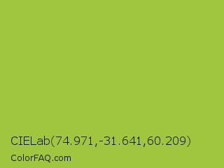 CIELab 74.971,-31.641,60.209 Color is a normal lime color and the nearest color is Android Green #a4c639. Hex code #a0c640 and RGB value is rgb(160,198,64). In RGB color space, this color is composed of 63% red, 78% green, 25% blue, In CMYK color space, this color is composed of 19% cyan, 0% magenta, 68% yellow , 22% black , In HSL color space, this color has a hue angle of 77° , 54% saturation and 51% lightness.