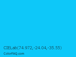 CIELab 74.972,-24.04,-35.55 Color is a normal cyan color and the nearest color is Spiro Disco Ball #0fc0fc. Hex code #0dc8f9 and RGB value is rgb(13,200,249). In RGB color space, this color is composed of 5% red, 78% green, 98% blue, In CMYK color space, this color is composed of 95% cyan, 20% magenta, 0% yellow , 2% black , In HSL color space, this color has a hue angle of 192° , 95% saturation and 51% lightness.