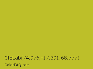 CIELab 74.976,-17.391,68.777 Color is a normal yellow color and the nearest color is Key Lime Pie #bfc921. Hex code #bdbf29 and RGB value is rgb(189,191,41). In RGB color space, this color is composed of 74% red, 75% green, 16% blue, In CMYK color space, this color is composed of 1% cyan, 0% magenta, 79% yellow , 25% black , In HSL color space, this color has a hue angle of 61° , 65% saturation and 45% lightness.