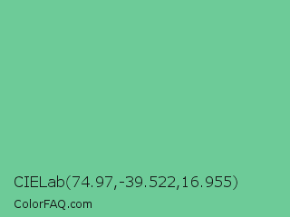 CIELab 74.97,-39.522,16.955 Color is a light green color and the nearest color is De York #7ac488. Hex code #6dcb98 and RGB value is rgb(109,203,152). In RGB color space, this color is composed of 43% red, 80% green, 60% blue, In CMYK color space, this color is composed of 46% cyan, 0% magenta, 25% yellow , 20% black , In HSL color space, this color has a hue angle of 147° , 47% saturation and 61% lightness.
