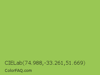 CIELab 74.988,-33.261,51.669 Color is a normal green color and the nearest color is Middle Green Yellow #acbf60. Hex code #99c754 and RGB value is rgb(153,199,84). In RGB color space, this color is composed of 60% red, 78% green, 33% blue, In CMYK color space, this color is composed of 23% cyan, 0% magenta, 58% yellow , 22% black , In HSL color space, this color has a hue angle of 84° , 51% saturation and 55% lightness.