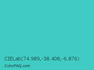 CIELab 74.989,-38.408,-6.876 Color is a normal cyan color and the nearest color is Medium Turquoise #48d1cc. Hex code #40ccc4 and RGB value is rgb(64,204,196). In RGB color space, this color is composed of 25% red, 80% green, 77% blue, In CMYK color space, this color is composed of 69% cyan, 0% magenta, 4% yellow , 20% black , In HSL color space, this color has a hue angle of 177° , 58% saturation and 53% lightness.