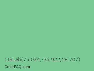 CIELab 75.034,-36.922,18.707 Color is a light green color and the nearest color is De York #7ac488. Hex code #77ca95 and RGB value is rgb(119,202,149). In RGB color space, this color is composed of 47% red, 79% green, 58% blue, In CMYK color space, this color is composed of 41% cyan, 0% magenta, 26% yellow , 21% black , In HSL color space, this color has a hue angle of 142° , 44% saturation and 63% lightness.