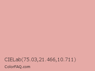 CIELab 75.03,21.466,10.711 Color is a light red color and the nearest color is Pastel Pink #dea5a4. Hex code #e6aaa6 and RGB value is rgb(230,170,166). In RGB color space, this color is composed of 90% red, 67% green, 65% blue, In CMYK color space, this color is composed of 0% cyan, 26% magenta, 28% yellow , 10% black , In HSL color space, this color has a hue angle of 4° , 56% saturation and 78% lightness.