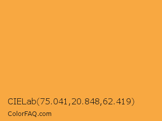 CIELab 75.041,20.848,62.419 Color is a light orange color and the nearest color is Neon Carrot #ffa343. Hex code #f8a841 and RGB value is rgb(248,168,65). In RGB color space, this color is composed of 97% red, 66% green, 25% blue, In CMYK color space, this color is composed of 0% cyan, 32% magenta, 74% yellow , 3% black , In HSL color space, this color has a hue angle of 34° , 93% saturation and 61% lightness.