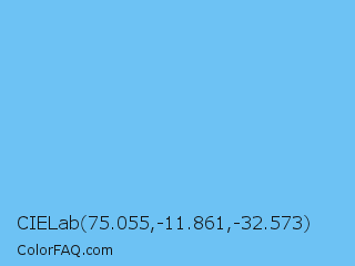 CIELab 75.055,-11.861,-32.573 Color is a light blue color and the nearest color is Maya Blue #73c2fb. Hex code #6dc2f4 and RGB value is rgb(109,194,244). In RGB color space, this color is composed of 43% red, 76% green, 96% blue, In CMYK color space, this color is composed of 55% cyan, 20% magenta, 0% yellow , 4% black , In HSL color space, this color has a hue angle of 202° , 86% saturation and 69% lightness.