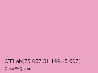 CIELab 75.057,31.199,-5.607 Color is a light rose color and the nearest color is Kobi #e79fc4. Hex code #eca4c4 and RGB value is rgb(236,164,196). In RGB color space, this color is composed of 93% red, 64% green, 77% blue, In CMYK color space, this color is composed of 0% cyan, 31% magenta, 17% yellow , 7% black , In HSL color space, this color has a hue angle of 333° , 65% saturation and 78% lightness.
