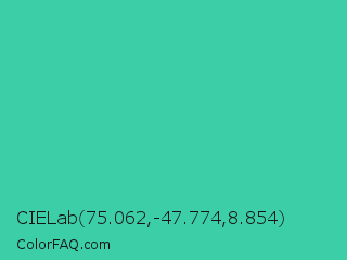 CIELab 75.062,-47.774,8.854 Color is a normal cyan color and the nearest color is Eucalyptus #44d7a8. Hex code #3ccfa7 and RGB value is rgb(60,207,167). In RGB color space, this color is composed of 24% red, 81% green, 65% blue, In CMYK color space, this color is composed of 71% cyan, 0% magenta, 19% yellow , 19% black , In HSL color space, this color has a hue angle of 164° , 60% saturation and 52% lightness.