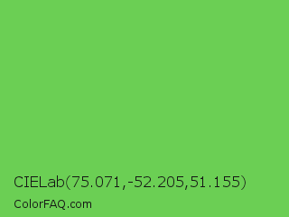 CIELab 75.071,-52.205,51.155 Color is a normal green color and the nearest color is Mantis #74c365. Hex code #6bcf54 and RGB value is rgb(107,207,84). In RGB color space, this color is composed of 42% red, 81% green, 33% blue, In CMYK color space, this color is composed of 48% cyan, 0% magenta, 59% yellow , 19% black , In HSL color space, this color has a hue angle of 109° , 56% saturation and 57% lightness.