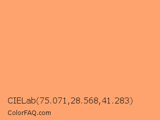 CIELab 75.071,28.568,41.283 Color is a light orange color and the nearest color is Light Salmon #ffa07a. Hex code #fea36e and RGB value is rgb(254,163,110). In RGB color space, this color is composed of 100% red, 64% green, 43% blue, In CMYK color space, this color is composed of 0% cyan, 36% magenta, 57% yellow , 0% black , In HSL color space, this color has a hue angle of 22° , 99% saturation and 71% lightness.