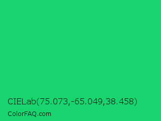 CIELab 75.073,-65.049,38.458 Color is a normal green color and the nearest color is Malachite #0bda51. Hex code #17d46e and RGB value is rgb(23,212,110). In RGB color space, this color is composed of 9% red, 83% green, 43% blue, In CMYK color space, this color is composed of 89% cyan, 0% magenta, 48% yellow , 17% black , In HSL color space, this color has a hue angle of 148° , 80% saturation and 46% lightness.