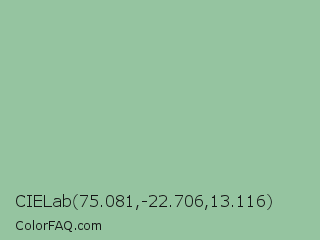 CIELab 75.081,-22.706,13.116 Color is a light green color and the nearest color is Eton Blue #96c8a2. Hex code #95c4a0 and RGB value is rgb(149,196,160). In RGB color space, this color is composed of 58% red, 77% green, 63% blue, In CMYK color space, this color is composed of 24% cyan, 0% magenta, 18% yellow , 23% black , In HSL color space, this color has a hue angle of 134° , 28% saturation and 68% lightness.