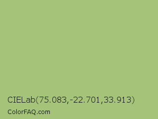 CIELab 75.083,-22.701,33.913 Color is a light green color and the nearest color is Olivine #9ab973. Hex code #a5c379 and RGB value is rgb(165,195,121). In RGB color space, this color is composed of 65% red, 76% green, 47% blue, In CMYK color space, this color is composed of 15% cyan, 0% magenta, 38% yellow , 24% black , In HSL color space, this color has a hue angle of 84° , 38% saturation and 62% lightness.