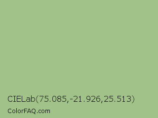 CIELab 75.085,-21.926,25.513 Color is a light green color and the nearest color is Swamp Green #acb78e. Hex code #a1c389 and RGB value is rgb(161,195,137). In RGB color space, this color is composed of 63% red, 76% green, 54% blue, In CMYK color space, this color is composed of 17% cyan, 0% magenta, 30% yellow , 24% black , In HSL color space, this color has a hue angle of 95° , 33% saturation and 65% lightness.