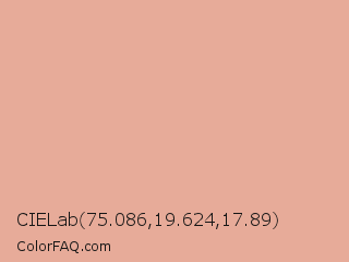 CIELab 75.086,19.624,17.89 Color is a light red color and the nearest color is Pastel Pink #dea5a4. Hex code #e7ab99 and RGB value is rgb(231,171,153). In RGB color space, this color is composed of 91% red, 67% green, 60% blue, In CMYK color space, this color is composed of 0% cyan, 26% magenta, 34% yellow , 9% black , In HSL color space, this color has a hue angle of 14° , 62% saturation and 75% lightness.