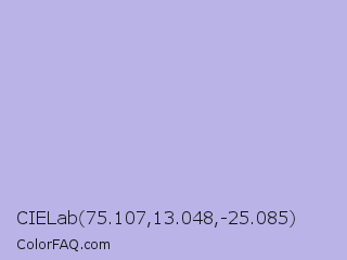 CIELab 75.107,13.048,-25.085 Color is a light indigo color and the nearest color is Maximum Blue Purple #acace6. Hex code #bab3e7 and RGB value is rgb(186,179,231). In RGB color space, this color is composed of 73% red, 70% green, 91% blue, In CMYK color space, this color is composed of 19% cyan, 23% magenta, 0% yellow , 9% black , In HSL color space, this color has a hue angle of 248° , 52% saturation and 80% lightness.