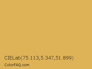 CIELab 75.113,5.347,51.899 Color is a light orange color and the nearest color is Sunray #e3ab57. Hex code #deb357 and RGB value is rgb(222,179,87). In RGB color space, this color is composed of 87% red, 70% green, 34% blue, In CMYK color space, this color is composed of 0% cyan, 19% magenta, 61% yellow , 13% black , In HSL color space, this color has a hue angle of 41° , 67% saturation and 61% lightness.
