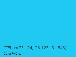 CIELab 75.124,-26.125,-31.546 Color is a normal cyan color and the nearest color is Spiro Disco Ball #0fc0fc. Hex code #1fc9f2 and RGB value is rgb(31,201,242). In RGB color space, this color is composed of 12% red, 79% green, 95% blue, In CMYK color space, this color is composed of 87% cyan, 17% magenta, 0% yellow , 5% black , In HSL color space, this color has a hue angle of 192° , 89% saturation and 54% lightness.