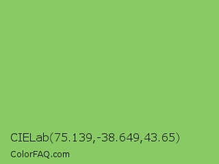 CIELab 75.139,-38.649,43.65 Color is a normal green color and the nearest color is Dollar Bill #85bb65. Hex code #89ca65 and RGB value is rgb(137,202,101). In RGB color space, this color is composed of 54% red, 79% green, 40% blue, In CMYK color space, this color is composed of 32% cyan, 0% magenta, 50% yellow , 21% black , In HSL color space, this color has a hue angle of 99° , 49% saturation and 59% lightness.