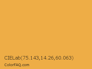 CIELab 75.143,14.26,60.063 Color is a normal orange color and the nearest color is Tulip Tree #eab33b. Hex code #eead46 and RGB value is rgb(238,173,70). In RGB color space, this color is composed of 93% red, 68% green, 27% blue, In CMYK color space, this color is composed of 0% cyan, 27% magenta, 71% yellow , 7% black , In HSL color space, this color has a hue angle of 37° , 83% saturation and 60% lightness.