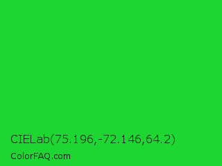 CIELab 75.196,-72.146,64.2 Color is a normal green color and the nearest color is Lime Green #32cd32. Hex code #1ed631 and RGB value is rgb(30,214,49). In RGB color space, this color is composed of 12% red, 84% green, 19% blue, In CMYK color space, this color is composed of 86% cyan, 0% magenta, 77% yellow , 16% black , In HSL color space, this color has a hue angle of 126° , 75% saturation and 48% lightness.