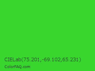 CIELab 75.201,-69.102,65.231 Color is a normal green color and the nearest color is Lime Green #32cd32. Hex code #37d52e and RGB value is rgb(55,213,46). In RGB color space, this color is composed of 22% red, 84% green, 18% blue, In CMYK color space, this color is composed of 74% cyan, 0% magenta, 78% yellow , 16% black , In HSL color space, this color has a hue angle of 117° , 67% saturation and 51% lightness.