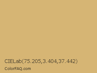 CIELab 75.205,3.404,37.442 Color is a light orange color and the nearest color is Harvest Gold #e0b974. Hex code #d6b574 and RGB value is rgb(214,181,116). In RGB color space, this color is composed of 84% red, 71% green, 45% blue, In CMYK color space, this color is composed of 0% cyan, 15% magenta, 46% yellow , 16% black , In HSL color space, this color has a hue angle of 40° , 54% saturation and 65% lightness.