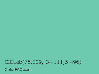 CIELab 75.209,-34.111,5.496 Color is a light green color and the nearest color is Medium Aquamarine #66ddaa. Hex code #6ecaae and RGB value is rgb(110,202,174). In RGB color space, this color is composed of 43% red, 79% green, 68% blue, In CMYK color space, this color is composed of 46% cyan, 0% magenta, 14% yellow , 21% black , In HSL color space, this color has a hue angle of 162° , 46% saturation and 61% lightness.