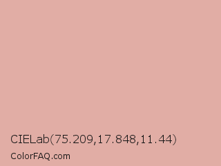 CIELab 75.209,17.848,11.44 Color is a light red color and the nearest color is Pastel Pink #dea5a4. Hex code #e1ada5 and RGB value is rgb(225,173,165). In RGB color space, this color is composed of 88% red, 68% green, 65% blue, In CMYK color space, this color is composed of 0% cyan, 23% magenta, 27% yellow , 12% black , In HSL color space, this color has a hue angle of 8° , 50% saturation and 76% lightness.
