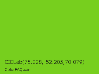 CIELab 75.228,-52.205,70.079 Color is a normal green color and the nearest color is Lima #76bd17. Hex code #77cf1e and RGB value is rgb(119,207,30). In RGB color space, this color is composed of 47% red, 81% green, 12% blue, In CMYK color space, this color is composed of 43% cyan, 0% magenta, 86% yellow , 19% black , In HSL color space, this color has a hue angle of 90° , 75% saturation and 46% lightness.